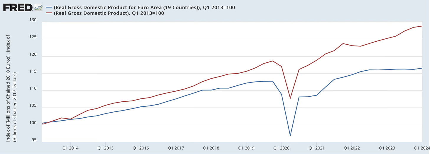 Here’s how the economies drifted apart over the last 10 years. In this chart, I indexed real GDP at 100 at the beginning of 2013 for both the U.S. and the Euro area. Please note it’s real GDP, i.e. removing the impact of differences in the inflation rate. Since 2013, the U.S. economy grew 12.3% more than the Euro-area economy. To put that into perspective: that’s an extra $7,000 per year in annual income on average!